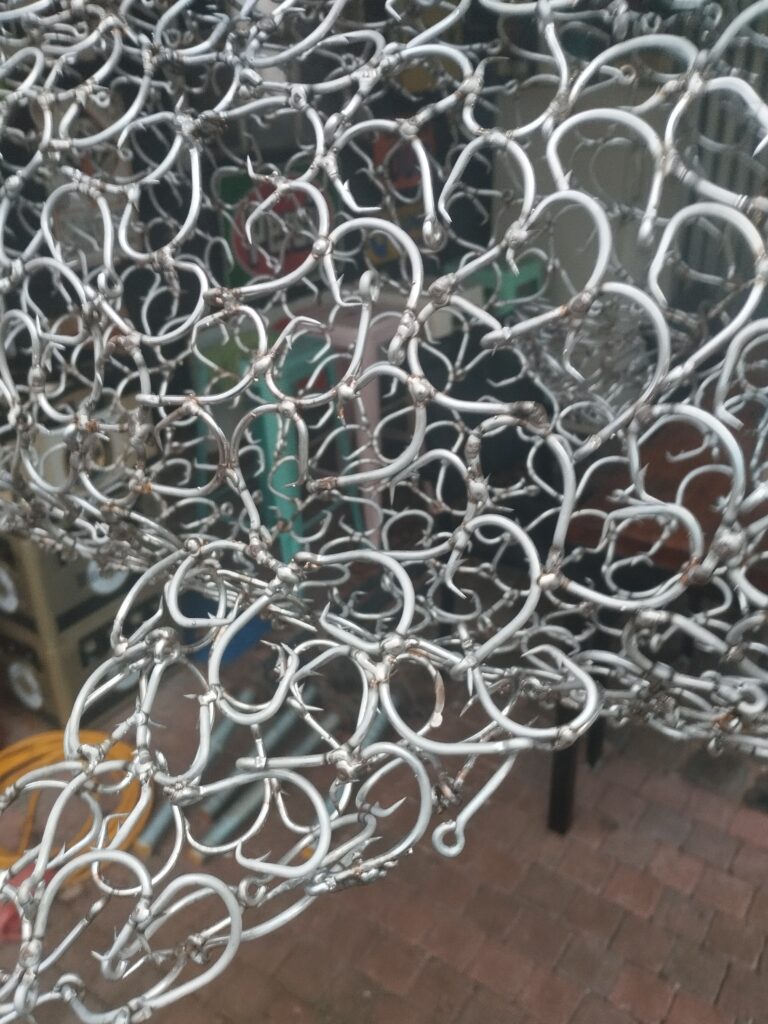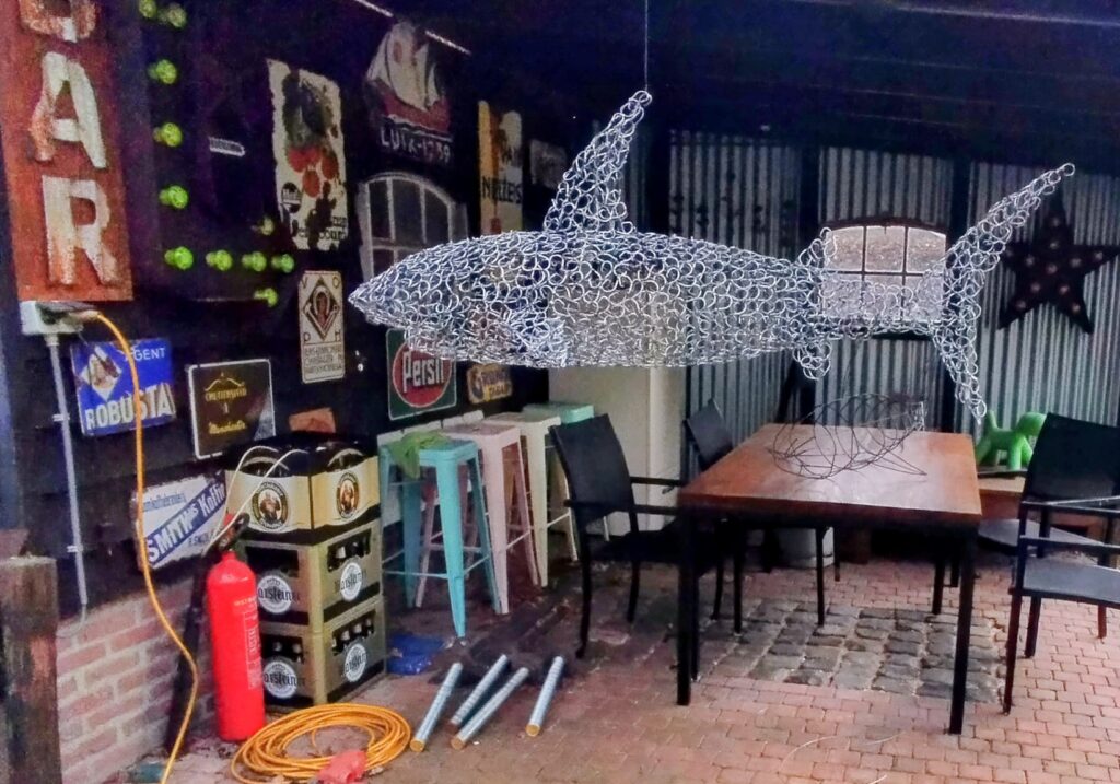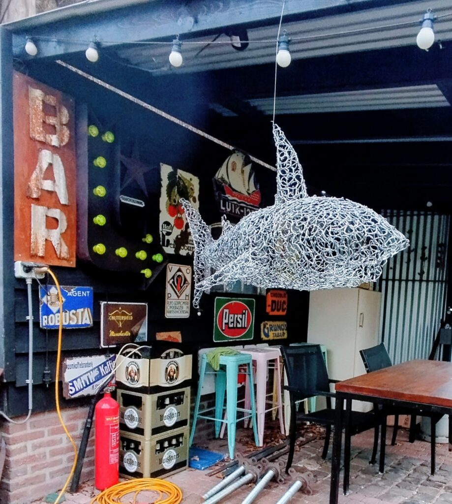 Eén keer eens iets anders als cortenstaal namelijk een witte haai gemaakt van 1500 roestvrijstalen vishaken van 5 cm hoog