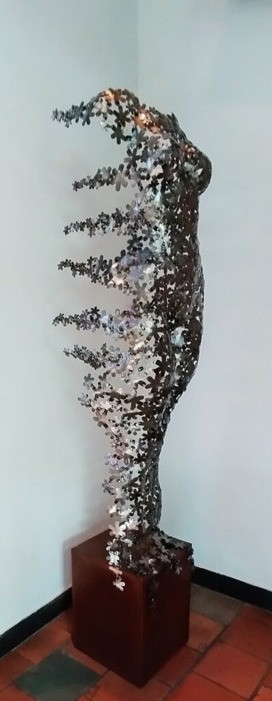Gemaakt van lasergesneden “vergeet me niet” bloemetjes, verschillende afmetingen 3 tot 6 cm doorsnee , cortenstaal, behandeld met Owatrol